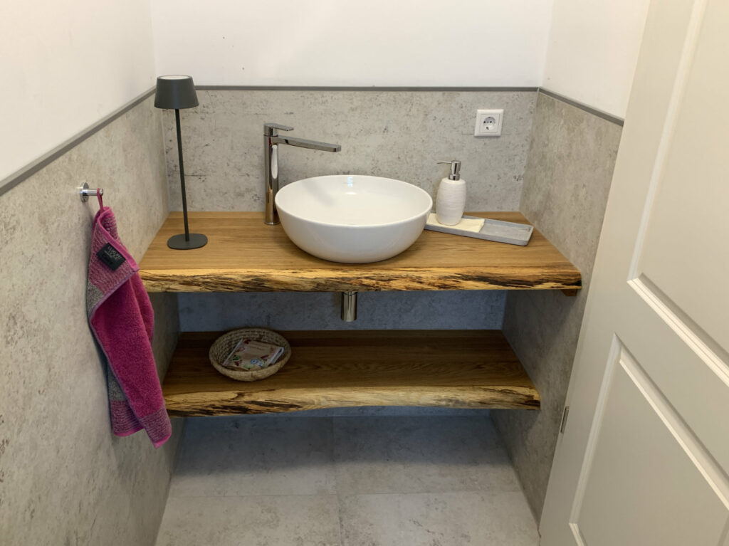 Freundliche Badeinrichtung mit Waschtisch und Holzvertäfelung